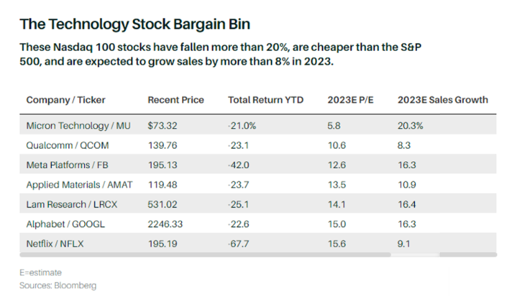 發仔注意到,Barron's在美股回暖之际总结了一份“值得捡便宜抄底”的科技股榜单。上榜标准是:今年跌幅超20%(计算股息影响)的纳斯达克100指数 $NDX 成分股、远期市盈率低于16.7倍(标普500成分股平均水平,基于2023年预期营收),同时2023年的销售额预计增长至少8%。相关数据均出自彭博。