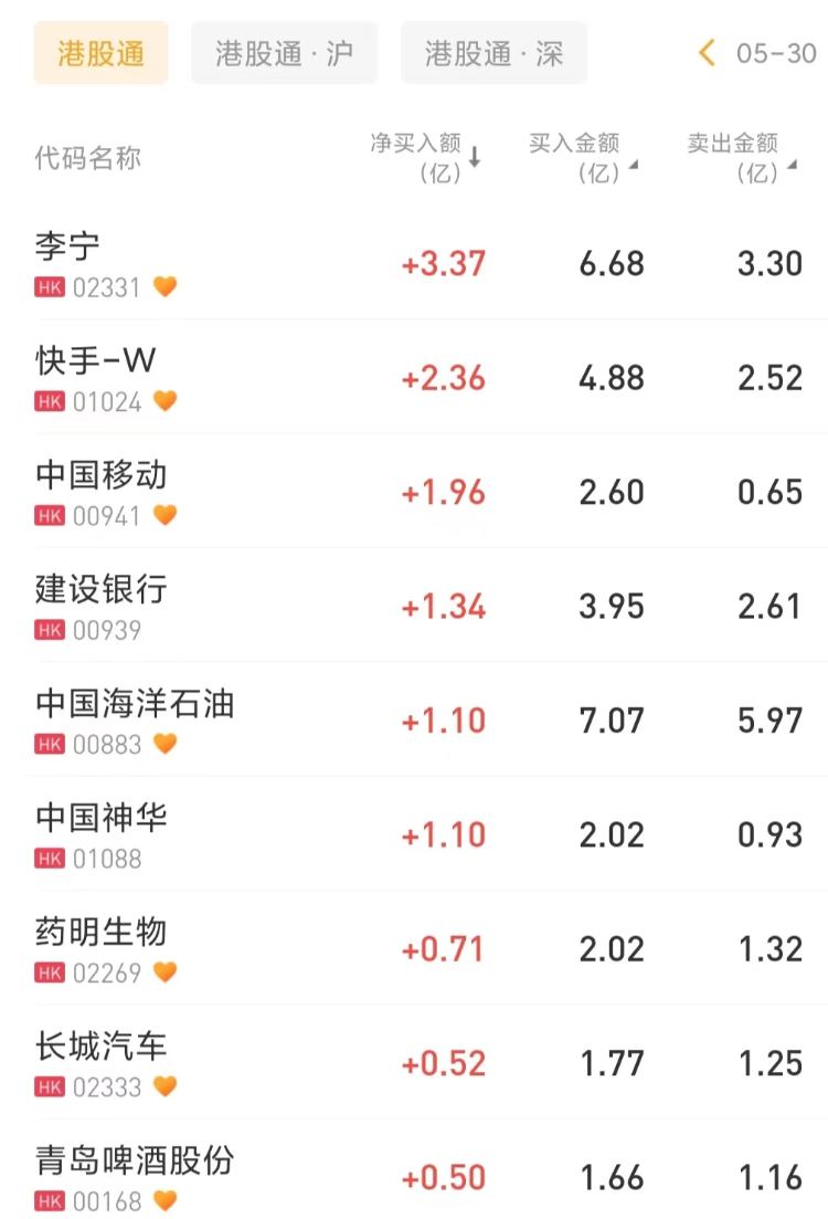 南下资金净买入李宁3.37亿港元,为今日买入之最。此外,南下资金净买入快手-W 2.36亿港元,净买入中国移动1.96亿港元。