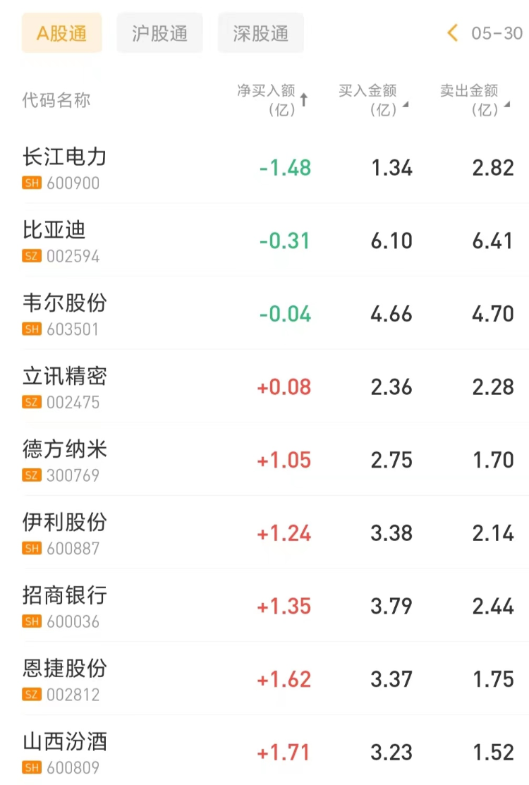 今日北上资金净卖出长江电力1.48亿元,比亚迪遭净卖出0.31亿元。