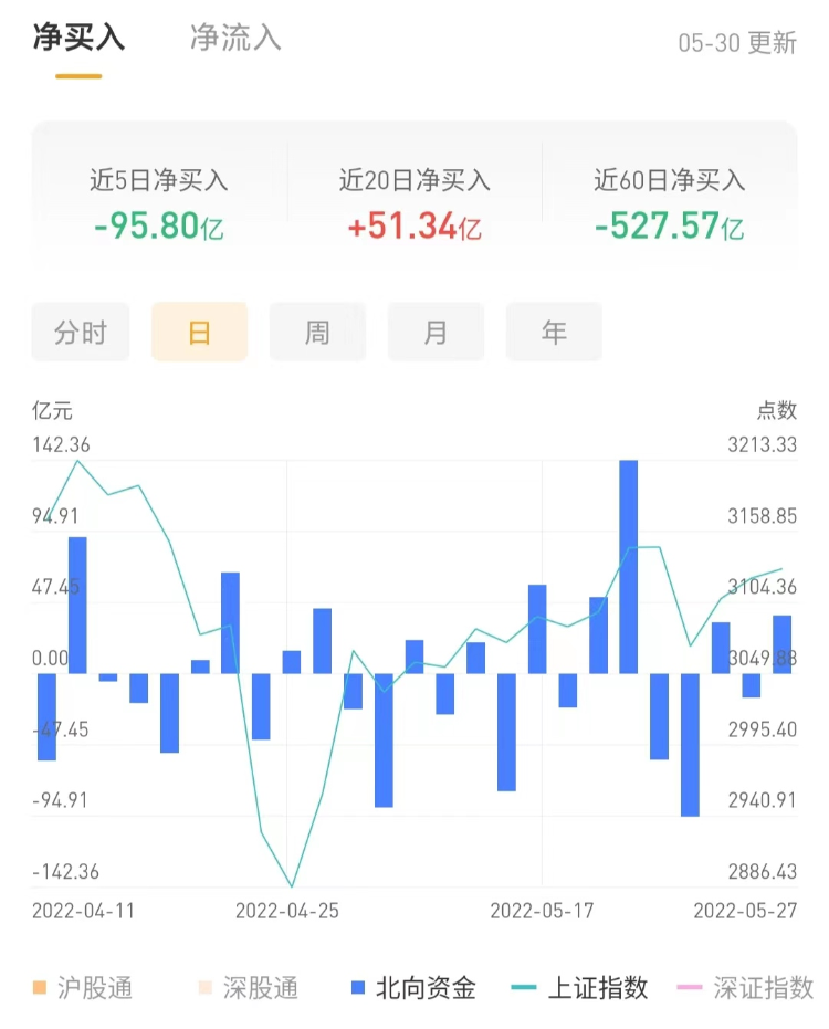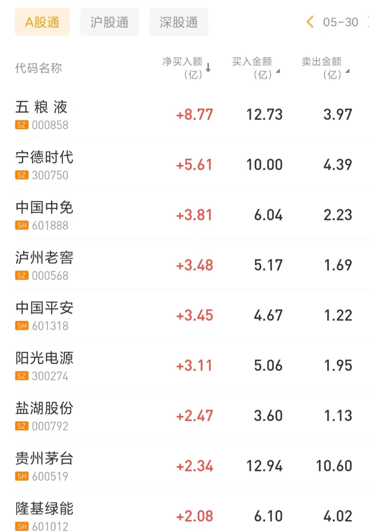 北上资金今日净买入五粮液8.77亿元,为今日买入之最;净买入宁德时代5.61亿元。