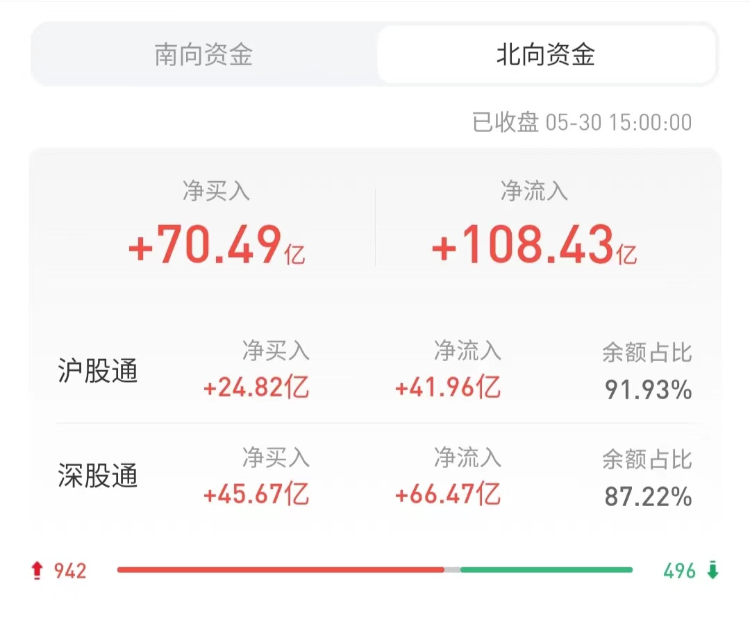 北上资金今日净买入70.49亿元,沪股通净买入24.82亿元,深股通净买入45.67亿元。上一交易日净买入39.01亿元。