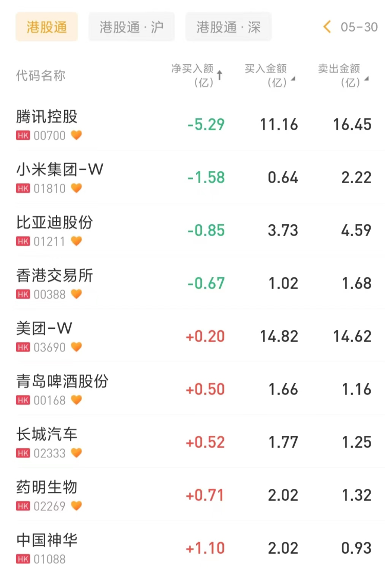 南下资金净卖出腾讯控股5.29亿港元,为今日卖出之最,净卖出小米集团-W 1.58亿港元。