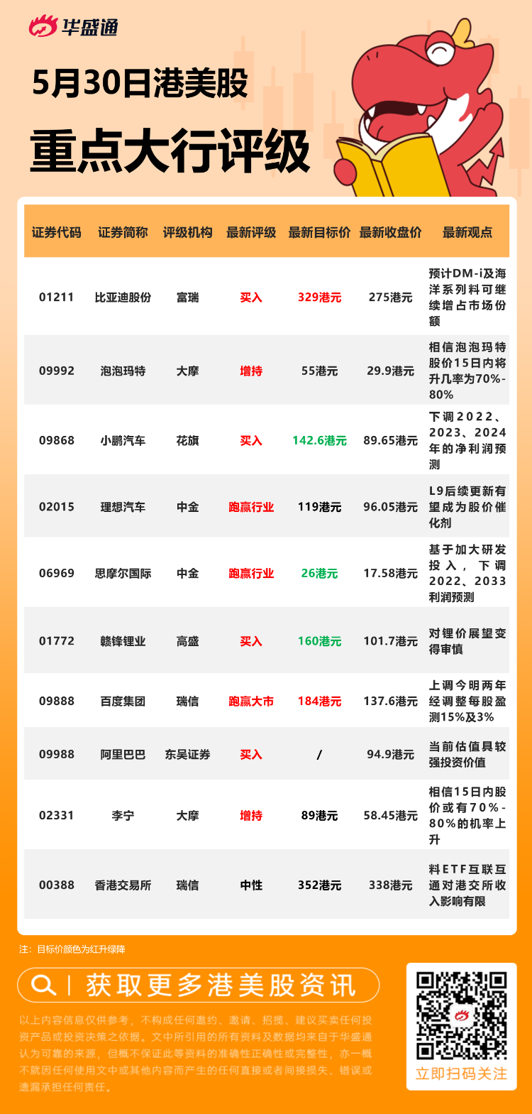 富瑞发表报告指,将汽油车与新能源车的负担能力进行研究,以了解消费者是否会继续购买新能源车,结论认为向新能源汽车转型并无变化。该行相信,比亚迪和小鹏汽车是新能源车大众市场的先行者,而比亚迪低成本和高性能的混能车DM-i及海洋系列料可继续增占市场份额,将其股份目标价由295.1港元上调至329港元,评级维持买入。
