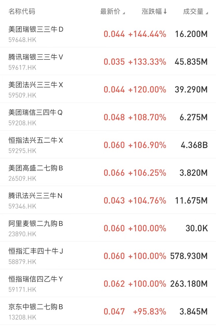 在今日涨幅榜中,居前包括:美团瑞银三三牛D $59648.HK 涨144.44%,腾讯瑞银三三牛V $59617.HK 涨133.33%,恒指法兴五二牛X $59295.HK 涨106.9%。