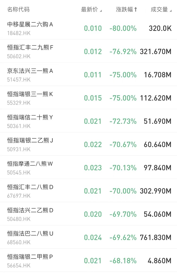在今日跌幅榜中,中移星展二六购A $18482.HK 跌80%,恒指汇丰二九熊F $50602.HK 跌76.92%。