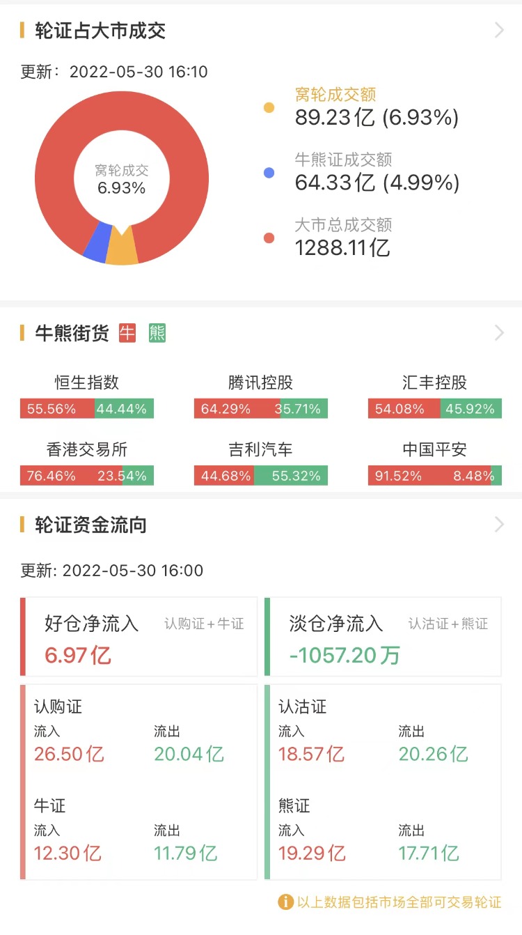 其中,窝轮总成交额为89.23亿港元,牛熊证总成交额为64.33亿港元。