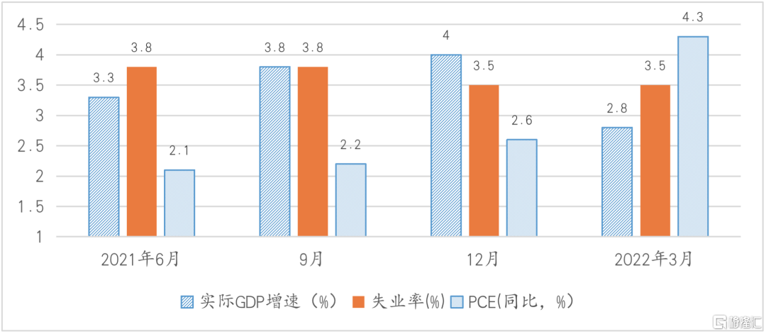 图1、美联储近1年以来对2022年美国经济核心指标预测的变化