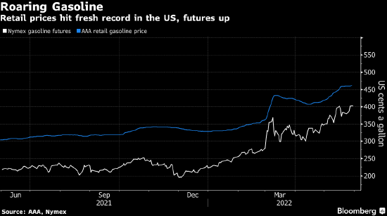 Nymex汽油期货周一早盘亦升,一度升至每加仑403.33美分的高位;如果按此水平结算,将创下又一个新高。布伦特和WTI原油期货也上涨,因中国放松防疫限制以及欧盟提议禁运俄罗斯原油。