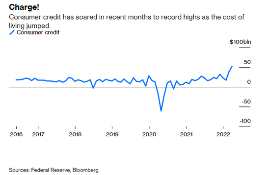 乍一看,这个数据似乎意味着,在通货膨胀飙升至1980年代初以来最高水平的当下,美国消费依旧保持韧性。但彭博分析师Robert Burgess认为,消费者不得不掏出更多的钱为他们的支出买单,这不是一个好兆头。