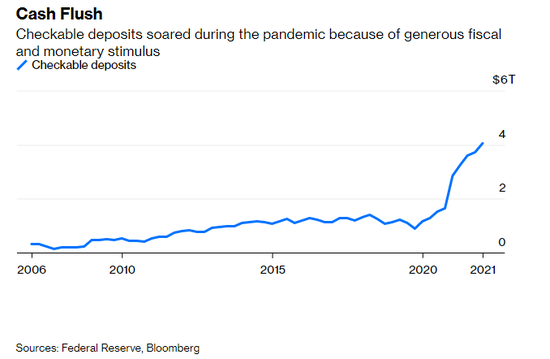 美国政府在疫情期间为支持经济的大放水让消费者建立了惊人的高现金缓冲。