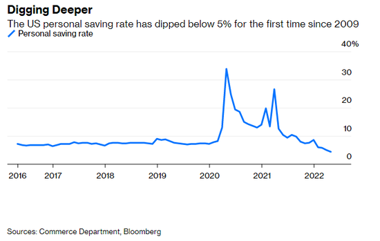 “个人储蓄率下降到2008年的低点表明,消费者正在弥补疫情期间损失的时间。不仅在商品上挥霍,还在自由支配的服务上挥霍,尽管通胀侵蚀了实际收入。”