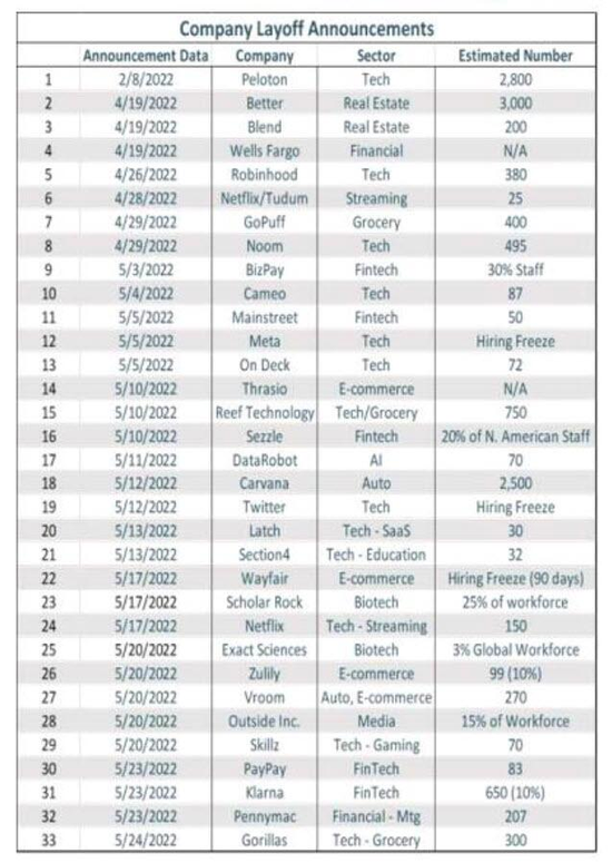 把时间调回现在,初请失业金人数在今年3月达到数十年低位后持续上升。在利润出现历史性收缩之际,多家公司宣布将执行裁员计划,或是冻结招聘。下图为美国投行Piper Sandler汇总的,最近所有发布大规模裁员公告的公司。美国公司裁员潮规模之大令人惊掉下巴。