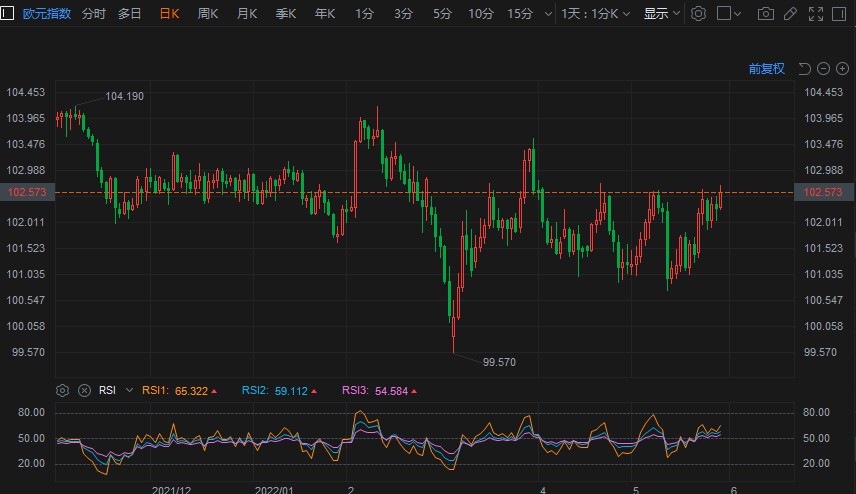 今日公布的德国通胀率数据显示,德国5月调和CPI同比增幅达8.7%超经济学家预期,续创40年来新高,再度提振欧洲央行退出新冠疫情时期刺激性货币措施的必要性。此前,西班牙公布的CPI数据也超过了经济学家普遍预期。在欧央行最早7月进行加息的预期之下,欧元指数近日不断升高,截至发稿涨0.3%至102.573。