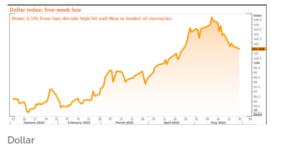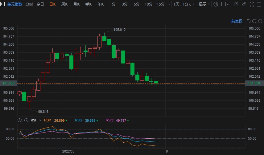 美元指数周一仍然延续两周以来的跌势,自5月13日以来,美元指数跌幅已超3.1%,从近20年来高位105.01跌至目前的101.55左右。有分析人士认为,美元走弱的主要原因是市场已消化一些较疲软的经济数据,而近日公布的经济数据令市场感到乐观,以及市场对美联储将从9月起放缓加息政策的押注力度加大带来的重要支撑,市场的整体风险偏好暂时呈上行趋势。