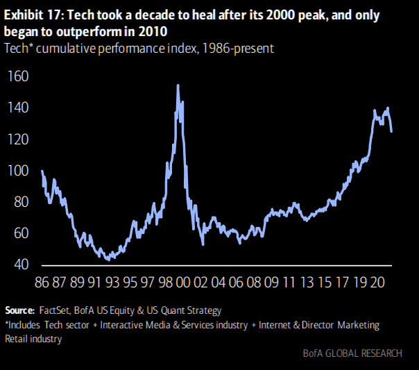 回顾2008年金融危机时科技股同样大幅下挫,现在大多数人只记得后来美股十几年长牛,但是当时高达腰斩的暴跌之后,科技股一直在底部徘徊了近4年时间,到2013年才开始重拾升势。