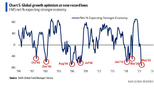 美银在最新发布5月基金经理调查中,以看空闻名的美银首席投资策略师Michael Hartnett表示,他的“末日”观点已经得到越来越多华尔街人士的认可。针对331名基金经理(总管理规模达到9860亿美元)的调查结果显示,与上个月相比他们大幅下降对全球增长的预期,并已经跌至历史新低(-72%)。