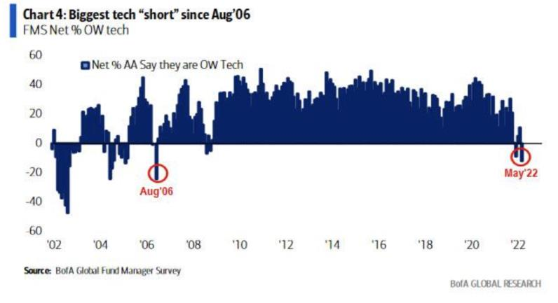 在科技股的大规模轮动之下,投资者超配科技股和防御类股票的比例下降至2008年金融危机以来低点。科技股空头创下2006年8月以来新高。