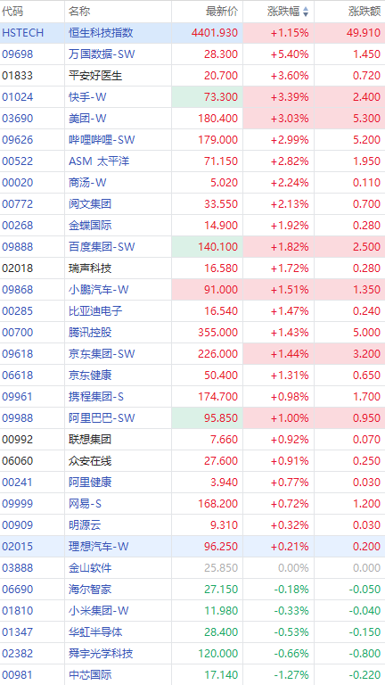 成分股中,万国数据涨超5%,快手、美团涨超3%,哔哩哔哩、商汤-W涨超2%,腾讯涨超1%。中芯国际、小米集团-W等轻微下挫。