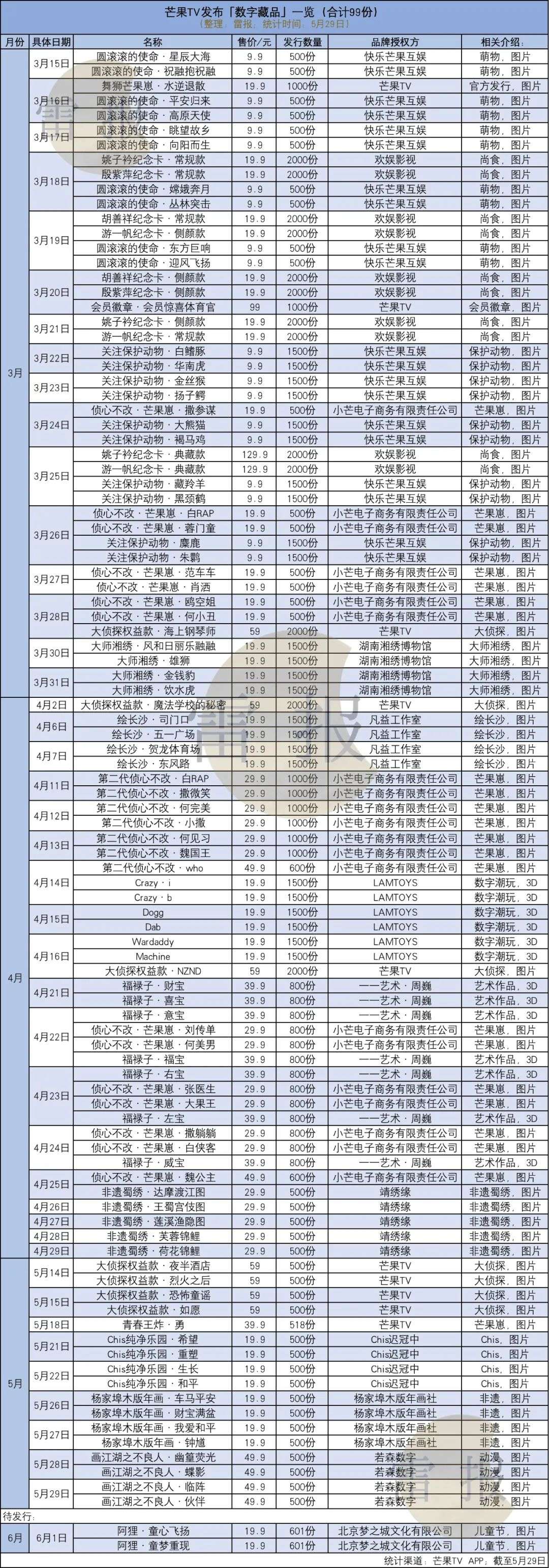 芒果TV在3月中旬上线基于芒果自研区块链“光芒链”搭建的数字藏品平台,首份数字藏品于3月15日开始发售,截至5月29日,共计发行99款数字藏品,6月1日还有2款数字藏品预备发售。