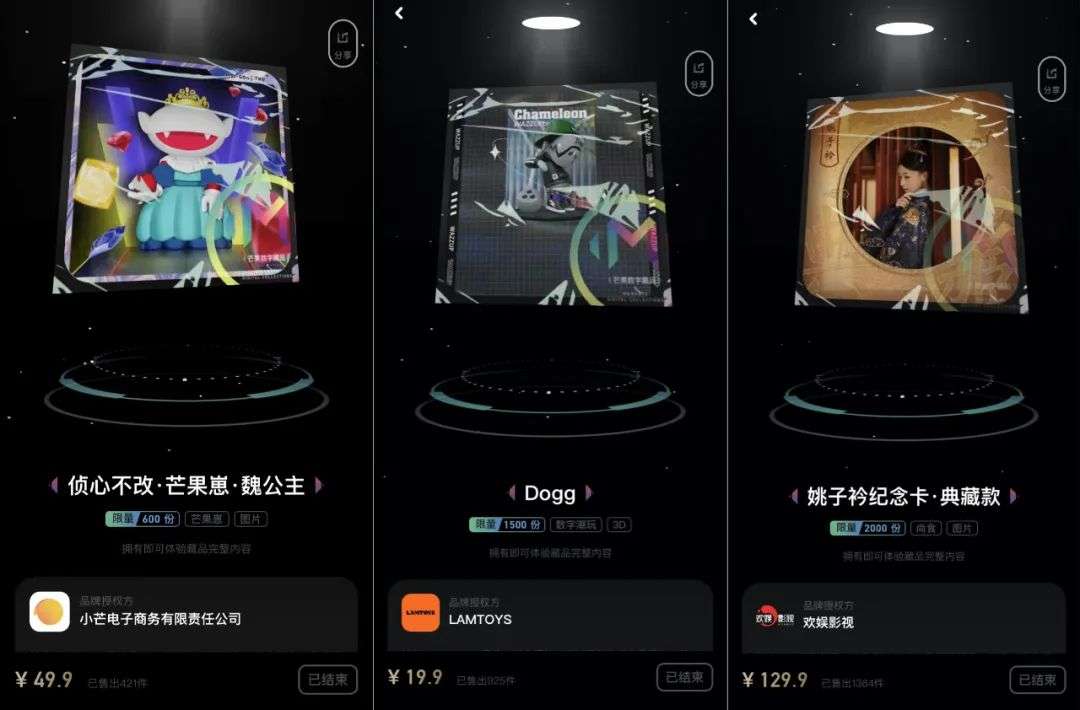 除了综艺,剧集、潮玩、非遗、动漫、艺术、公益等领域数字藏品,芒果TV也有涉及,如在芒果TV播出的电视剧《尚食》,开发出人物“纪念卡·常规款/侧颜款”,售价19.9元,单款限量2000份;该系列典藏款售价129.9元,单款限量发售2000份,品牌授权方为欢娱影视。