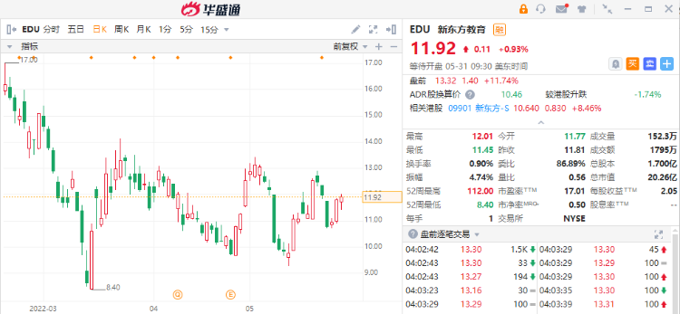 华盛资讯5月31日消息,美股盘前,热门中概股普涨,新东方教育(EDU)涨近12%,哔哩哔哩(BILI)、京东(JD)、百度(BIDU)均涨超6%,阿里巴巴(BABA)涨4.3%,拼多多(PDD)涨3.5%。中国海外互联网ETF $KWEB 涨近6%。
