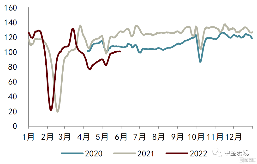供应链疏通,供给冲击缓解。新订单环比+5.6ppt至49.6%,其中新出口订单环比+4.6ppt至46.2%,弱于整体,显示内需恢复状况好于外需。而分项中改善幅度最大的是供货商配送时间,环比+6.9ppt至44.1%,但仍然低于正常水平。本轮疫情影响最严重的当属物流和供应链,而随着疫情缓解和一系列疏通物流和保障供应链的政策措施见效,5月物流和供应链状况改善较大。G7大数据公布的货运物流指数也显示5月全国公路货运物流状况相比4月有了较大改善,其中吉林快速修复,而即使是上海,也有一定的改善。供应链疏通也带动了生产和原材料库存的改善,生产分项环比+5.3ppt至49.7%,原材料库存环比+1.4ppt至47.9%。物价压力也有所缓解,主要原材料购进价格和出厂价格分别环比-8.4ppt、-4.9ppt至55.8%、49.5%。