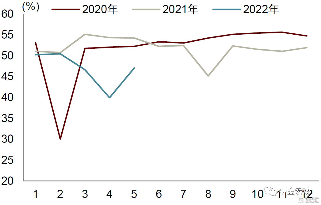 基建和地产分化。虽然整体建筑业商务活动指数环比-0.5ppt至52.2%,但这主要是由于房屋建筑业的拖累,5月房屋建筑业商务活动指数环比继续下滑,且大幅低于历史均值。房地产业商务活动指数也仅小幅环比改善,而绝对水平低于历史均值。而统计局表示:“土木工程建筑业商务活动指数和新订单指数分别为62.7%和59.1%,高于上月1.7个和6.8个百分点,均在上月较高基数水平上继续上行。[1]”这显示了随着疫情缓解和专项债等资金的加速投放,基建开工状况进一步向好。
