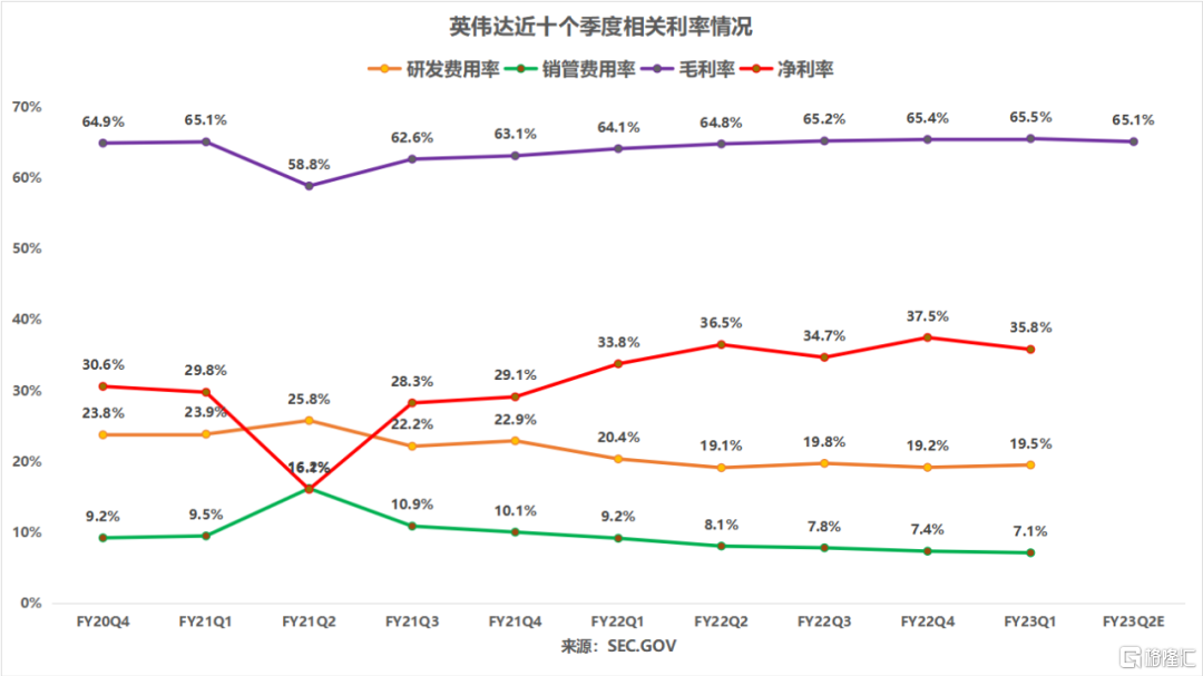 毛利率为65.5%(指引64.7%-65.7%,上季为65.4%),通过增加库存及支付大额预付款给相关晶圆厂商,以保证货源的稳定供应,目前英伟达已能够消化成本上升和来自供应链的压力(渠道库存已接近正常化,预计Q2库存将保持在当前水平左右),预计Q2毛利率将维持在当前水平。