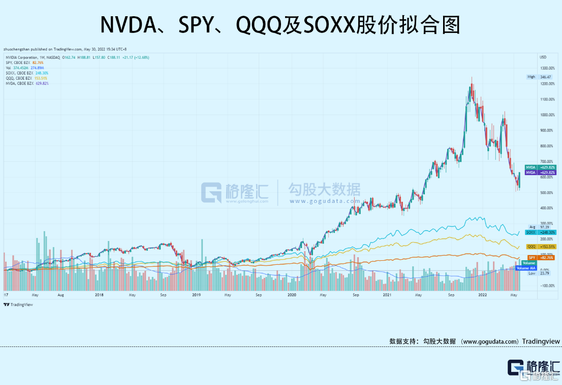 截止22年5月27日收盘,英伟达21年全年涨幅为124.44%,22年至今涨幅为-35.88%,跑输同期标普500指数ETF(SPY:-11.38%)及费城半导体指数(SOXX:-20.1%)和纳指100ETF(QQQ:-21.38%)。