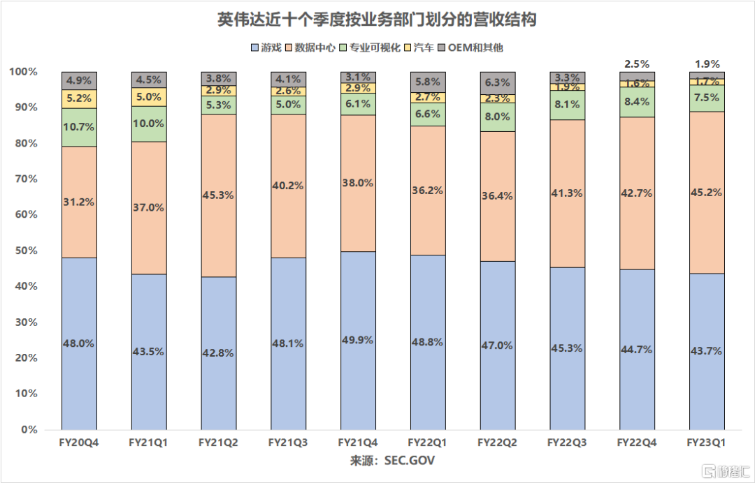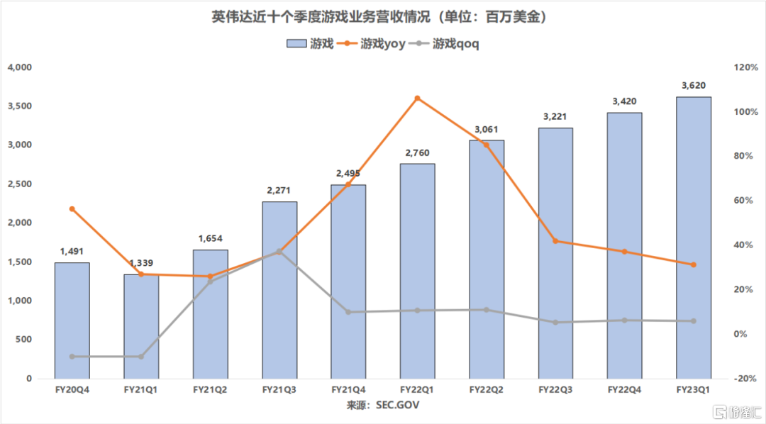 在GeForce RTX 30系列产品周期的推动下(预估目前GeForce游戏GPU安装量的近三分之一都在RTX上),游戏业务营收同比增长31.2%至36.2亿美元(预期34.6亿美元,上季增37.1%)。从终端需求来看,游戏行业的潜在动力非常强劲:在过去两年,就有1亿新的游戏玩家进入了PC行业。但受中国疫情封锁和俄乌冲突的影响,Q2来自游戏业务的营收可能会下降10%左右。