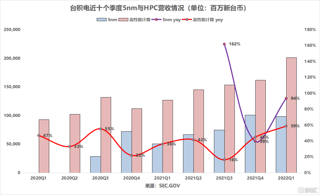 从台积电在高性能计算(HPC)和5nm的发展,可侧面印证HPC的高景气度及制程升级的趋势。此前(3月21日),据DIGITIMES,高举AI大旗的GPU龙头NVIDIA在2022年迎来新旧产品交替期,先进封测供应链人士透露,NVIDIA重兵集结数据中心用高效运算(HPC)芯片,而台积电2022年先进封装CoWoS所需的封装基材与散热材料,订单量暴增约3倍。供应链也传出,NVIDIA内部预计,数据中心 HPC芯片业绩将有年成长上看200~250%左右的高目标,预计其基于新的Hopper架构的数据中心,以及AI芯片解决方案将大大推动这一增长。若进度顺利,NVIDIA新一代计算芯片最快22Q3初出货,采用台积电5nm强化版的新产品可望问世。