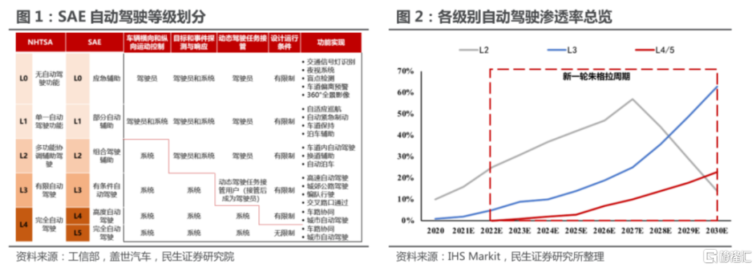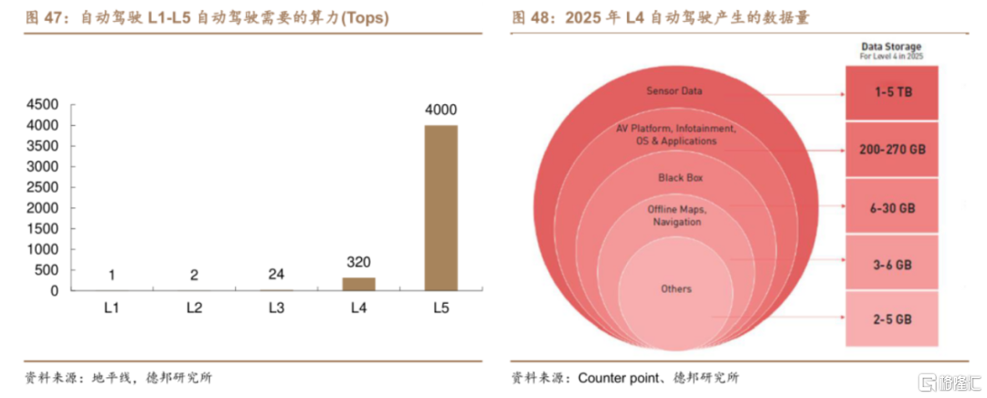 汽车自动驾驶正在由L2级别向更高级别过渡,更高级别的自动驾驶系统,每提高一级,对算力的需求都会10倍提升。L2级自动驾驶汽车所需的AI算力小于10TOPS,L3需要的AI计算力为30~60TOPS,L4需要的AI计算力在100TOPS以上,L5级自动驾驶需要AI计算力为500~1000TOPS。更高的算力将要求汽车芯片具备更高的硬件性能。