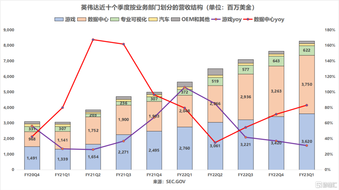 分业务来看,游戏和数据中心两大核心业务营收双双刷新上季新高,数据中心增速更胜上季。