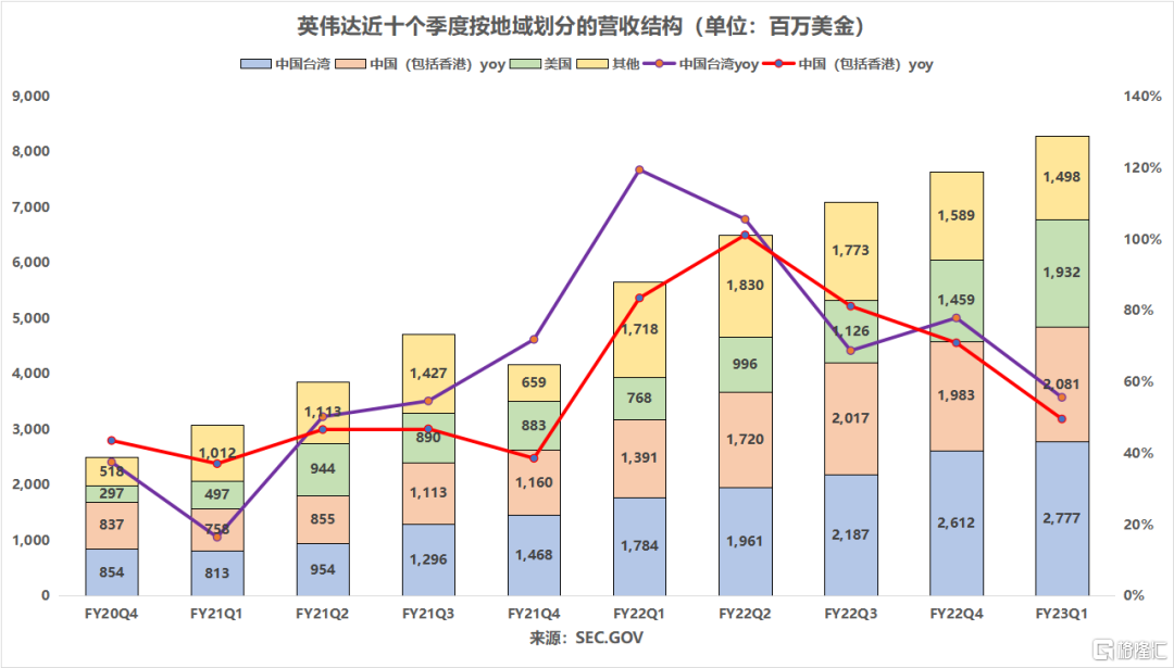 数据中心营收同比增长83.1%至37.5亿美元(预期36亿美元,上季增71.5%),连续十一个季度创新高。继FY21Q2以来,本季数据中心业务营收占比再度超过游戏业务,成为英伟达的第一大营收来源。Q1来自超大规模和云计算客户的销售收入同比翻了一倍多,垂直行业(主要包括消费互联网公司、金融服务和电信)的需求依旧旺盛,网络方面的营收加速增长,数据中心未来仍有持续强劲增长的势头。