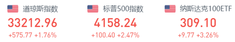 截至5月27日周五收盘,道琼斯指数上涨1.76%报33212.96点;标普500指数大涨2.47%报4158.24点;纳斯达克指数上涨3.33%报12131.13点。截至上周,道琼斯指数累计大涨6.24%;标普500指数累计收涨6.58%;纳斯达克指数累计上涨6.84%。
