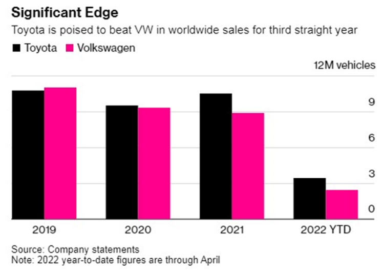 今年前4个月,丰田汽车全球销量已超过大众汽车100万辆,虽然两家汽车制造商的业务都受到了疫情的限制,但丰田汽车更好地控制了损失。这家日本制造商周一表示,今年前四个月全球销量下降了5.8%,而其德国竞争对手的销量下降了26%。
