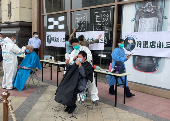 在上海环球港复业当日,财联社记者看到除开业迎客的各项布置外,商场入口旁还设置了4个免费理发的摊位,吸引了不少居民前来排队。