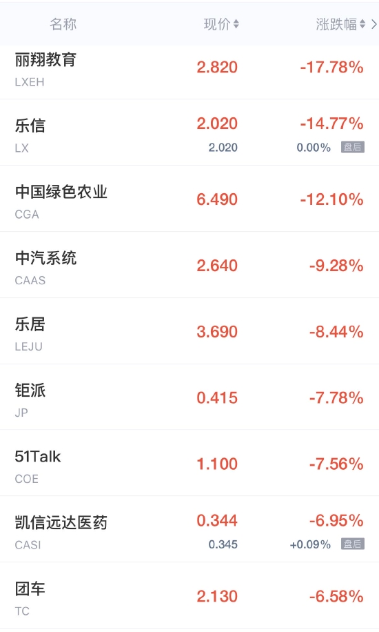 乐居跌超8%,51Talk跌超7%,云集、团车跌超6%,优信跌超5%,叮咚买菜、名创优品、涂鸦智能跌超4%,雾芯科技、蘑菇街、猎豹移动跌超2%。