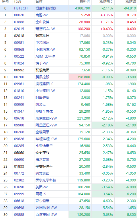 成分股中,商汤-W逆市涨超3%,金山软件涨超1%。万国数据-SW、百度集团-SW盘中跌幅扩大逾5%,京东健康跌超4%,网易-S、美团-W跌超3%,阿里巴巴-SW、京东跌超2%,小米等跌超1%。