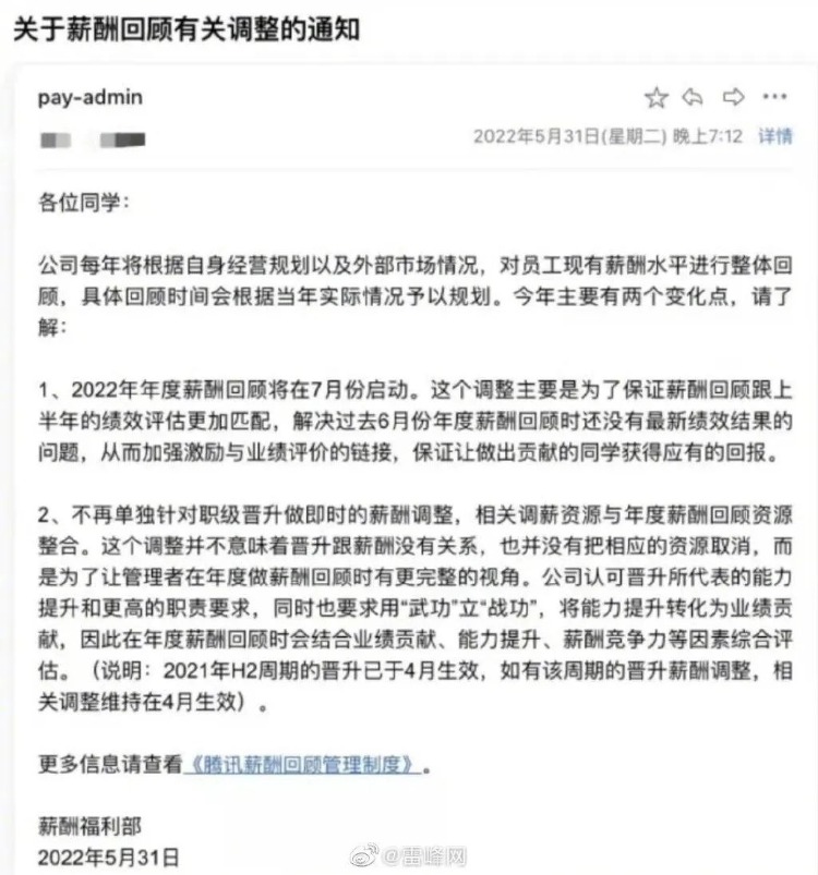 6月1日,据澎湃新闻报道,腾讯(00700.HK)于5月31日发布内部全员邮件,宣布开启新一轮薪酬改革。邮件中提到:未来腾讯将不再单独针对职级晋升做即时的薪酬调整,腾讯年度薪资回顾将从原来的6月份改至7月份,并且立即执行。