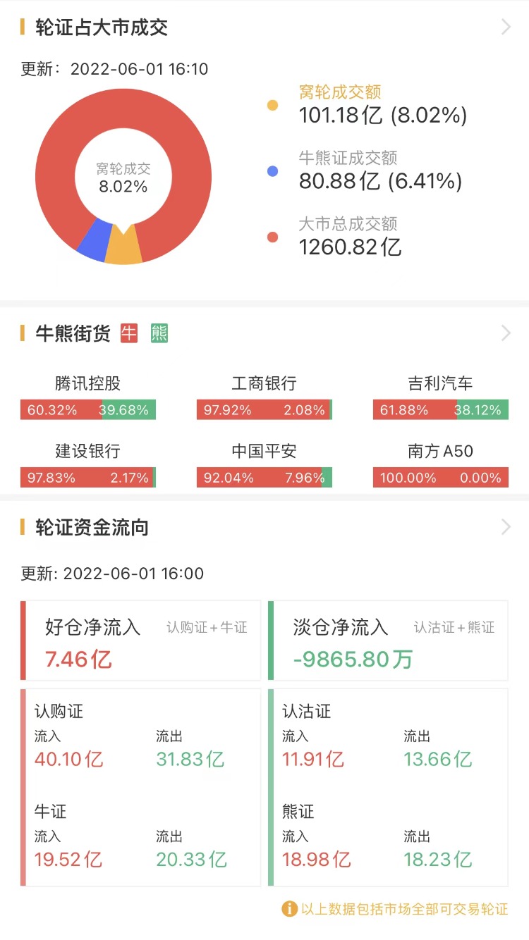 其中,窝轮总成交额为101.18亿港元,牛熊证总成交额为80.88亿港元。