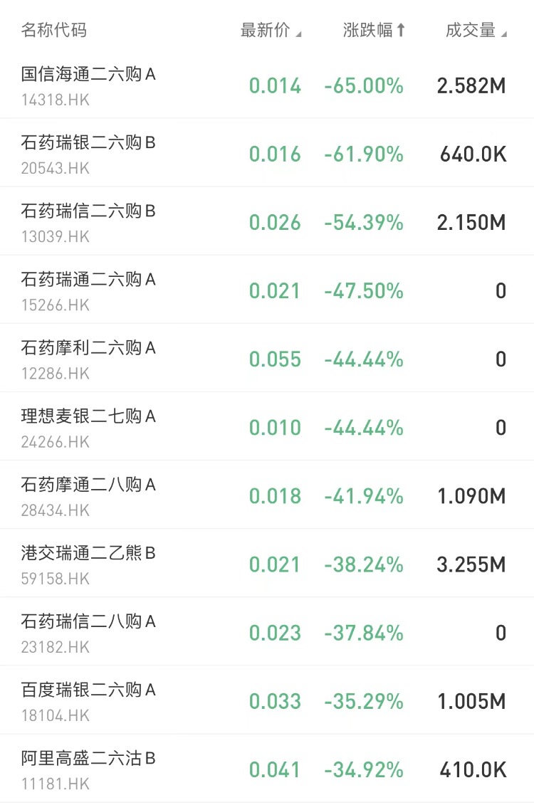 在今日跌幅榜中,国信海通二六购A $14318.HK 跌65%,石药瑞银二六购B $20543.HK 跌61.9%。