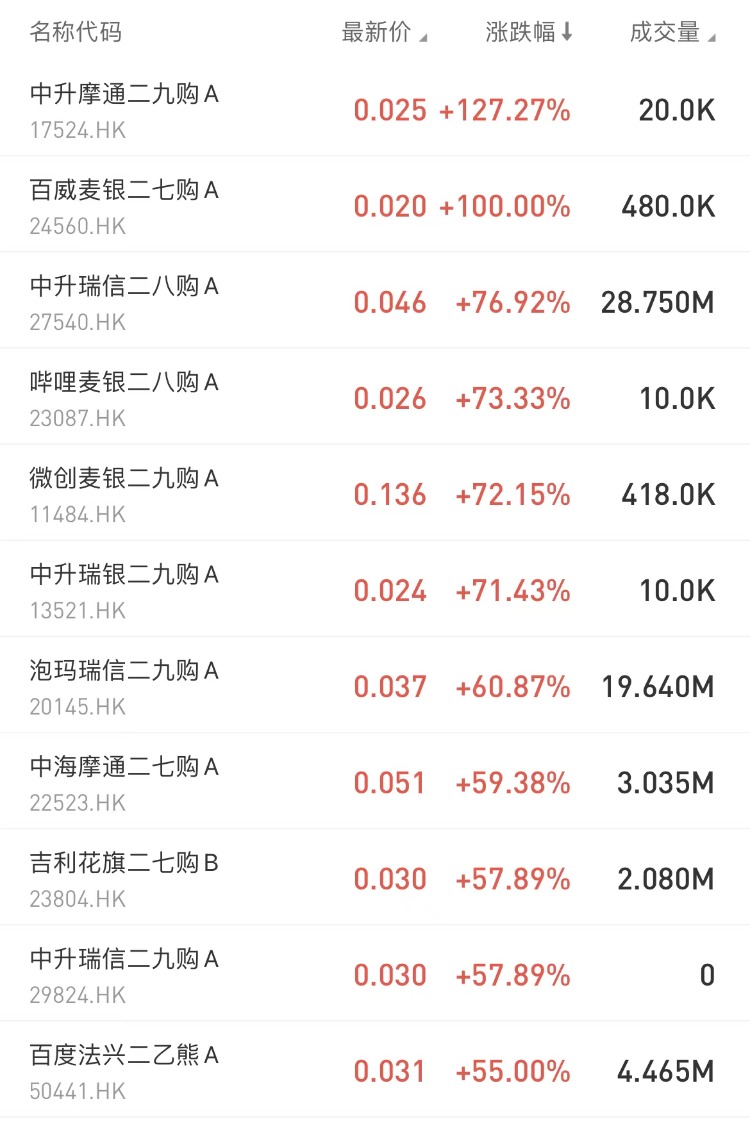 在今日涨幅榜中,居前包括:中升摩通二九购A $17524.HK 涨127.27%,百威麦银二七购A $24560.HK 涨100%,哔哩麦银二八购A $23087.HK 涨73.33%。