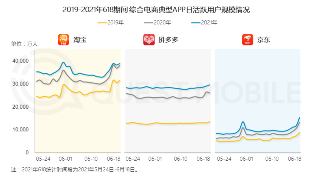 事实上,618的颓势在去年便已初露端倪。根据QuestMobile的报告,去年618期间,淘宝、京东和拼多多三大电商APP的引流效果都较2020年出现退步,拼多多和淘宝在活动期间的APP日活跃用户增幅明显低于前值。