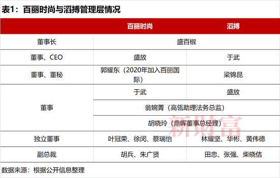 百丽时尚的管理团队与滔搏高度重合,尤其是董事会,除了董秘、独立董事不同之外,其他非独立董事均同在两家公司任职,并且,盛放、于武两人有“交叉任职”的意味(表1)。