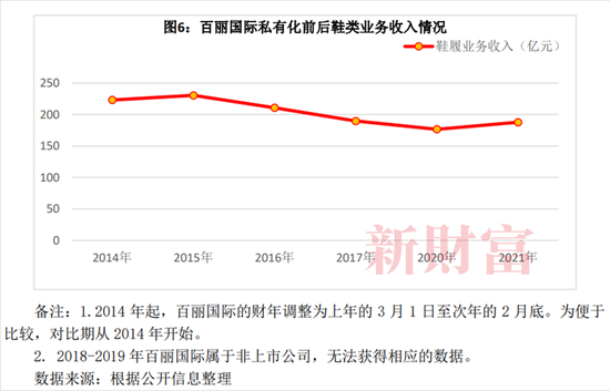 2020-2021年,百丽时尚鞋业务分别实现营业收入176.62亿元、187.68亿元。2021年的收入水平相当于百丽国际2017年退市时的鞋类业务收入水平。而2017年是百丽国际私有化前4年中鞋类业务收入最低的一年(图6)。