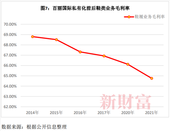 收入的变化或许会受资产重组的影响,比如,百丽国际私有化后,出售、清算了部分业务,这将会影响收入的增长幅度。但百丽时尚的毛利率也在逐年下降,不仅没有改变私有化前百丽国际鞋类业务毛利率不断下滑的趋势,而且已显著低于私有化前的水平(图7)。