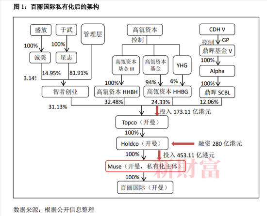 Topco也是融资平台,但主要用于归集股东投资的股本资金173.11亿港元,其中,高瓴出资142.8亿港元、鼎晖出资30.31亿元港元、智者创业所持有的百丽国际持有14.72%股份(折合78.21亿港元),三者合计出资约531.32亿港元。