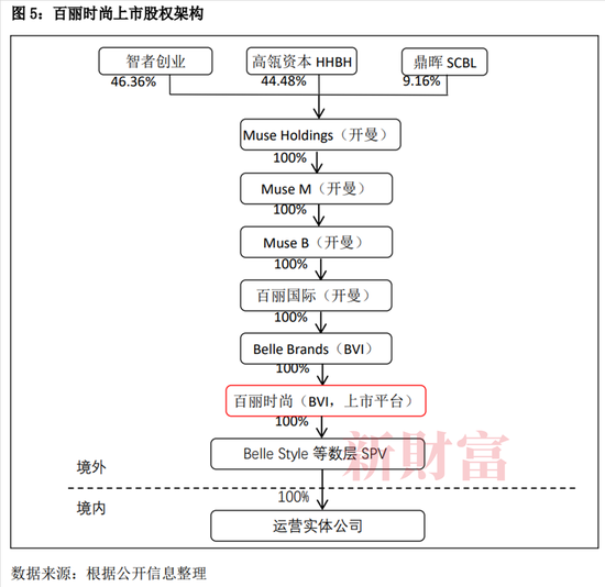 百丽国际剥离滔搏后,主营业务是剩下的鞋类和少量的服装业务。为运作上市,百丽国际采取了与滔搏相似的架构,先在BVI设立百丽品牌(Belle Brands)和百丽时尚,继而将旗下业务重组归入百丽时尚旗下,并以百丽时尚作为上市平台(图5)。
