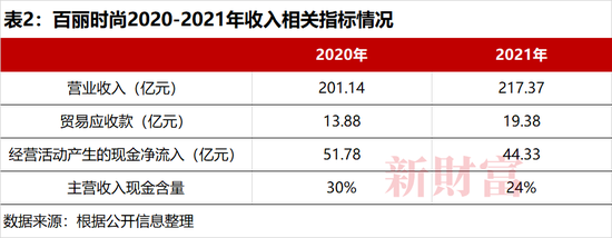 毛利率下降的同时,百丽时尚的主营收入现金含量也从2020年的30%下降至2021年的24%。